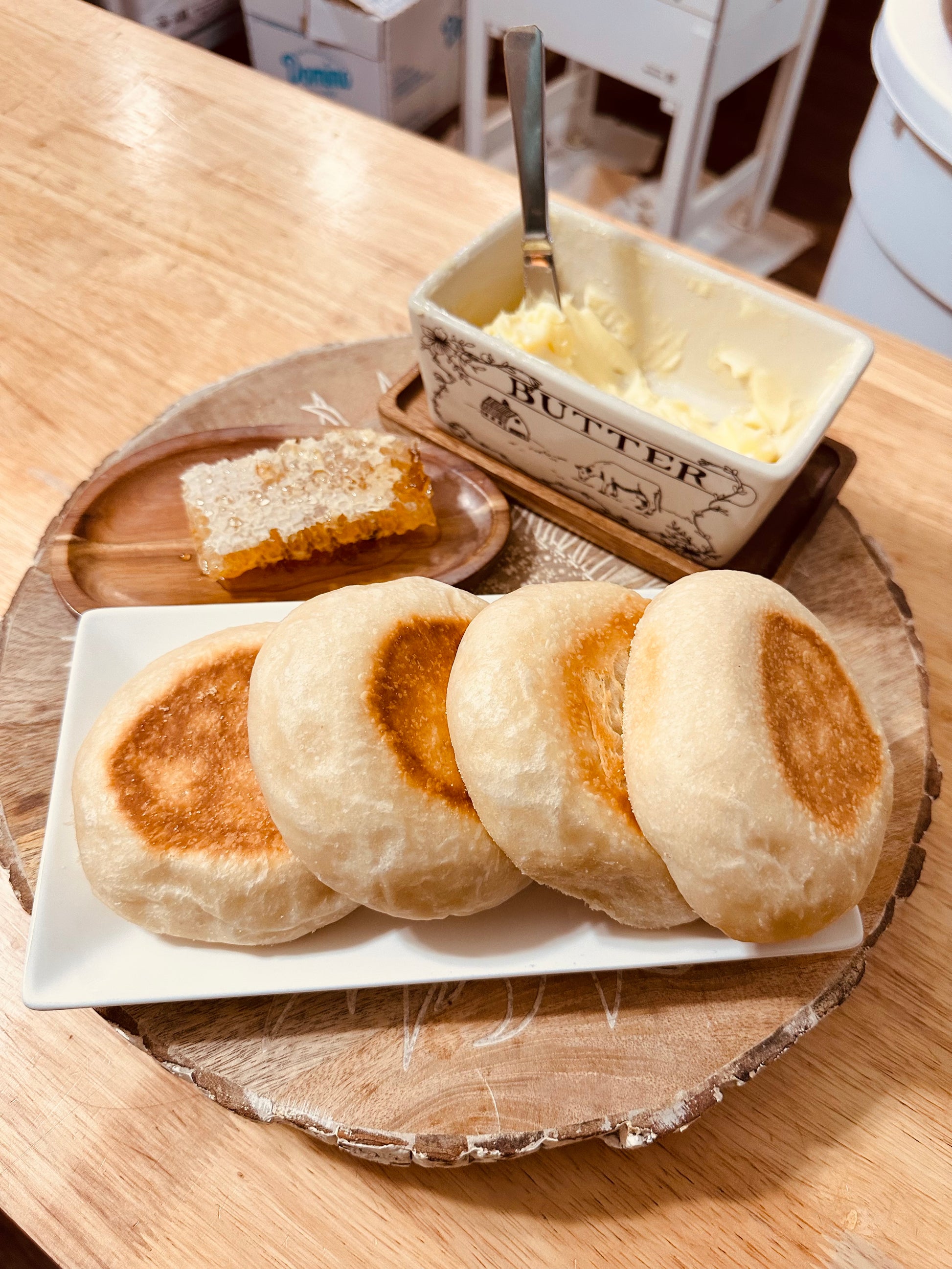 Our ORGANIC sourdough English Muffins! Soft, fresh and mild flavors on the inside. (4-pack)
