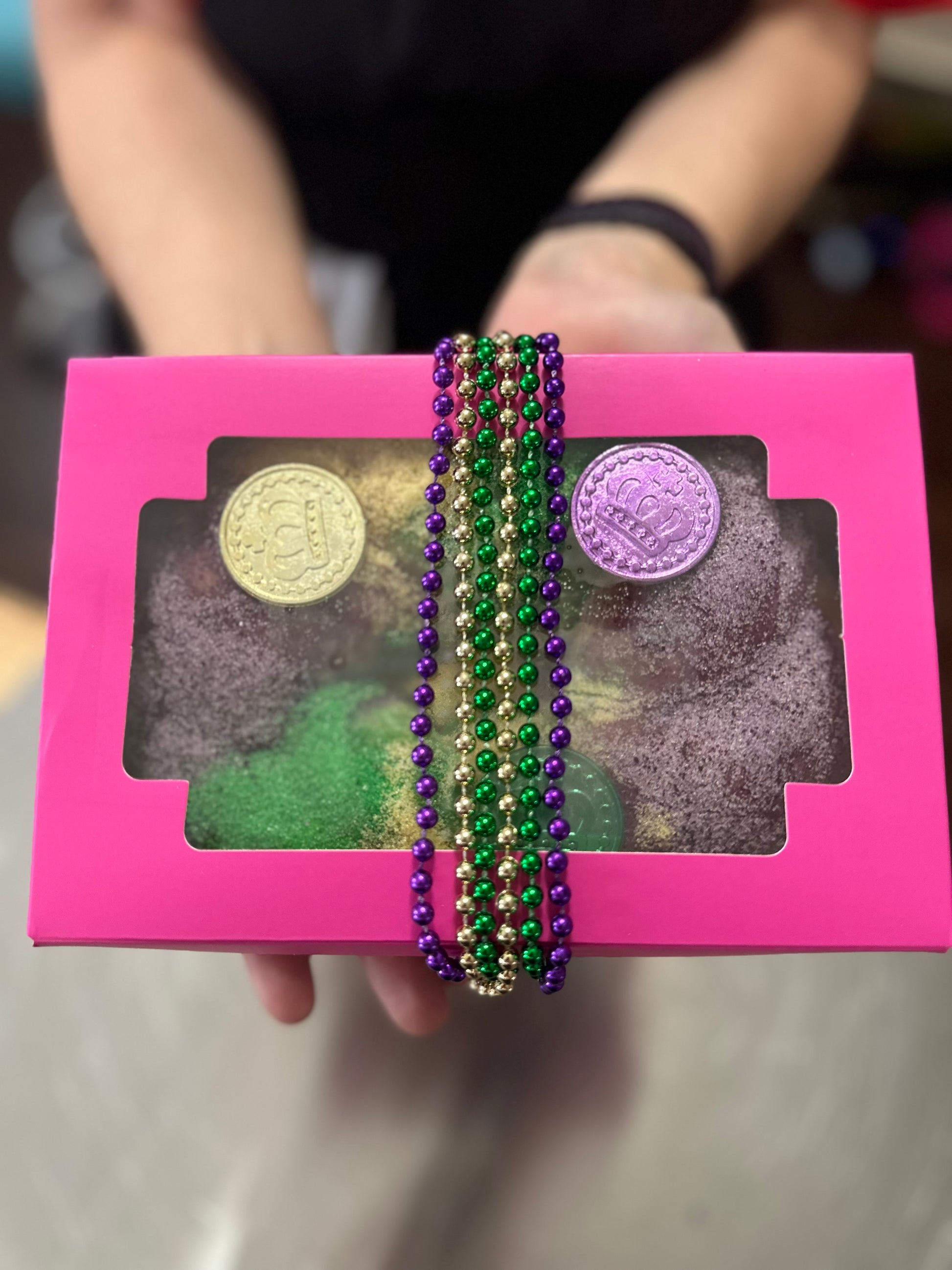 The cake is filled with a cinnamon pecan praline filling and adorned with a light icing topped with colorful sanding sugar. It comes complete with traditional touches: a hidden baby, festive beads, and collectible coins, symbolizing the joy and surprises of the season.